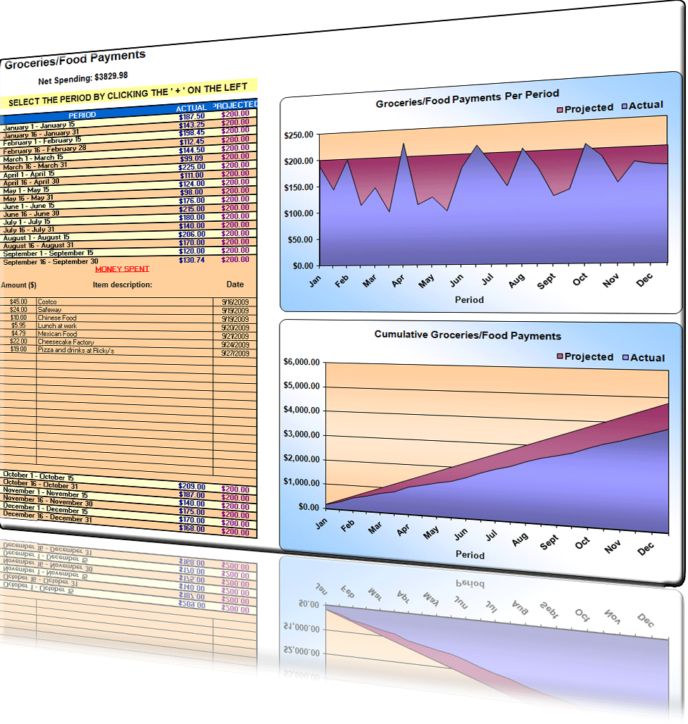 | Each expense category has its own tracker spreadsheet in BudgeX to input expenses, complete with collapsible tabs sorted by pay period and visual budget planner charts. The planner charts make it even easier for you to notice when you are getting close to your customized budget limits, and manage your money accordingly. These expense tracker spreadsheets are also customizable to fit your own personal categories! |