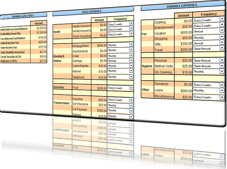 | Planning your home or personal budget is easier than ever, thanks to the BudgeX Starting Page spreadsheet. With this spreadsheet, you will be able to create a budget that works for you in 15 minutes or less! The simple three step process in the software guides you through the entire procedure for entering your planned expenses and forecasting your results. Spending fifteen minutes here can save you thousands by the end of the year! |